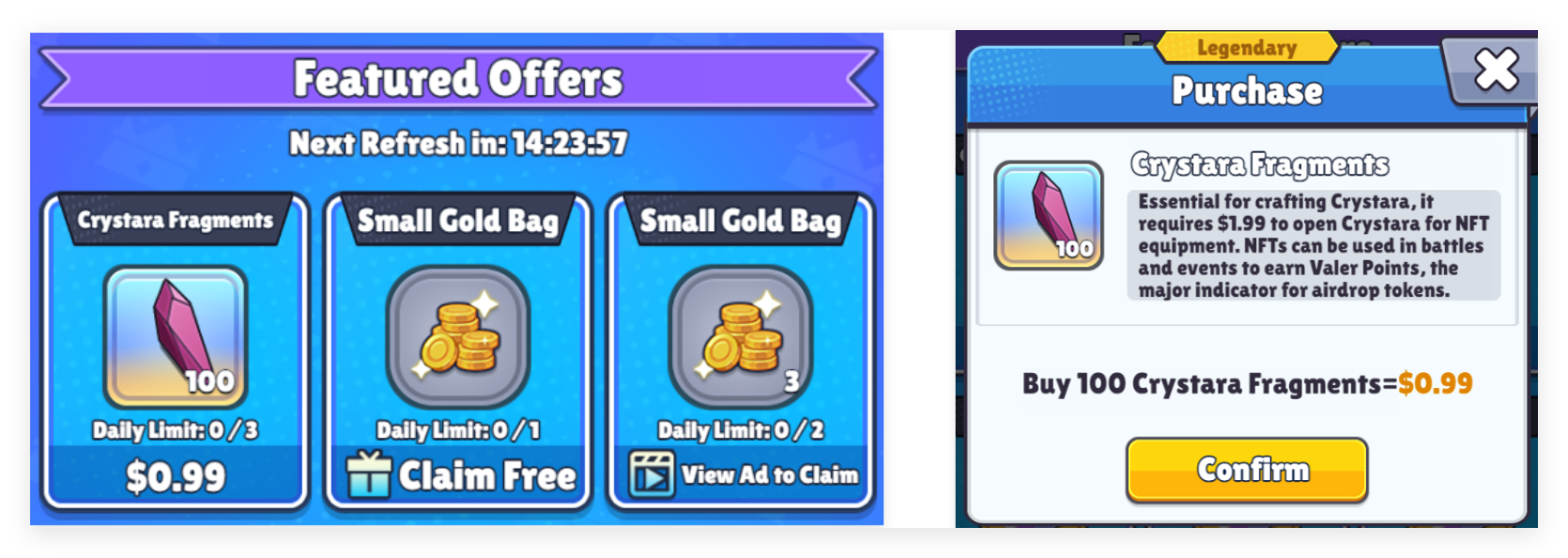 Crystara is the exclusive method for unlocking NFTs in Valor Quest. It is crafted from Crystara Fragments, which players collect through various gameplay actions.